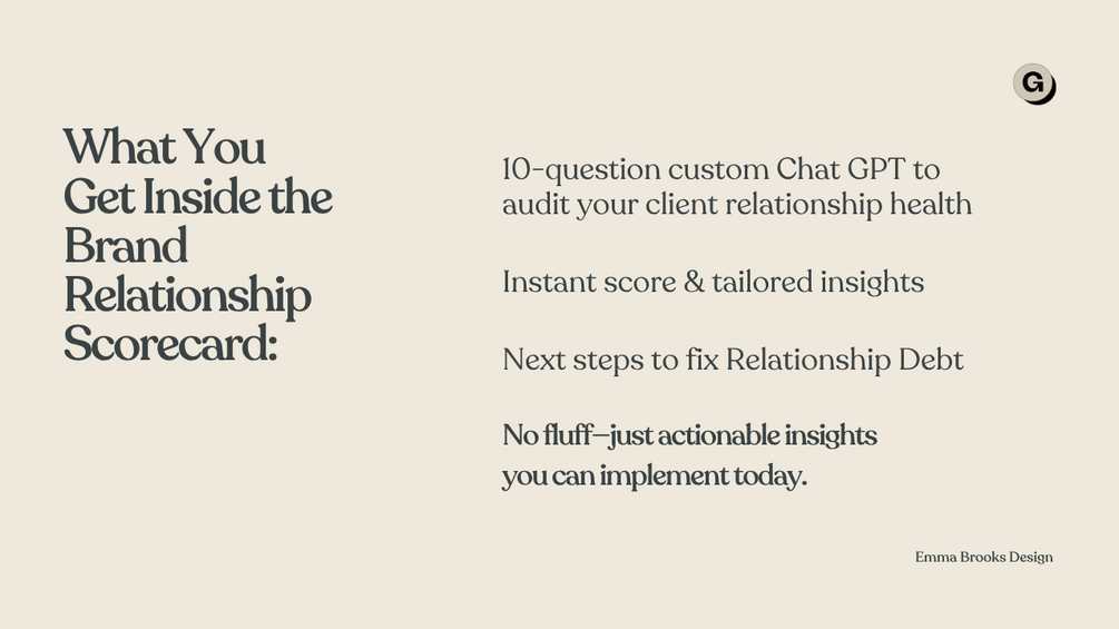 ✅ Identify Your Brand Relationship Debt Score – Discover whether your client relationships are strong, at risk, or costing you business.